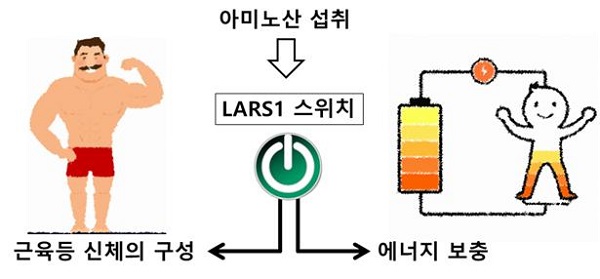 LARS1 효소의 역할아미노산은 단백질을 구성하는 기본 영양소로서 우리 몸을 구성하는 가장 중요한 구성성분이지만, 몸의 에너지 수준이 낮아지면 에너지를 발생시키는 연료로도 사용된다. 하지만 아미노산이 몸의 에너지 수준을 어떻게 감지해 이러한 전환이 일어나는 지에 대해서는 아직 밝혀지지 않았다.