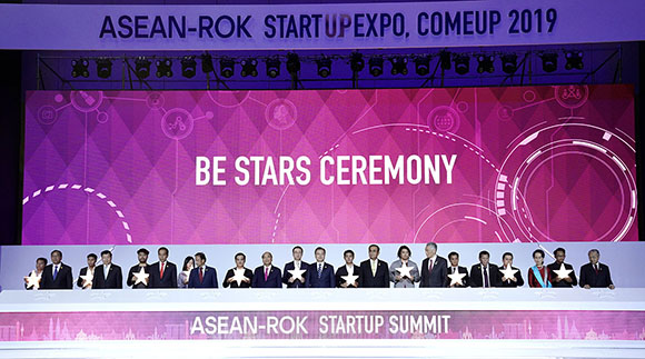문재인 대통령과 아세안 정상들이 지난달 26일 부산 벡스코에서 열린 2019 한-아세안 특별 정상회의 ‘스타트업 서밋’ 행사에서 각국 스타트업 대표로부터 받은 별 모양의 조각을 포디움에 끼워 넣는 세리머니를 하고 있다. (사진=청와대) |