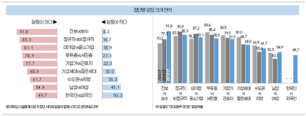 이어 갈등이 ‘크다’는 응답은 정규직-비정규직 85.3%, 대기업-중소기업 81.1%, 부유층-서민층 78.9%, 기업가-근로자 77.7% 등의 순서였으며, 남성-여성 간은 54.9%, 한국인-외국인 간은 49.7%로 나타났다. 경제적 양극화에 대해서도 ‘심각하다‘ 90.6%로 매우 높게 나타났다.