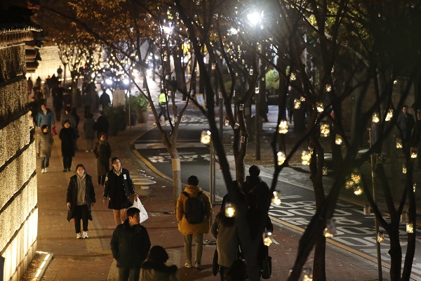 올해 일과 여가의 균형을 모범적으로 지원, 운영한 기업 44개사가 ‘2019 여가친화기업’에 새롭게 선정됐다. 사진은 퇴근 후 시민들이 서울 중구 덕수궁 돌담길에 설치된 ‘소원반디’ 전등 아래 발걸음을 옮기고 있다.(사진=(c) 연합뉴스) |
