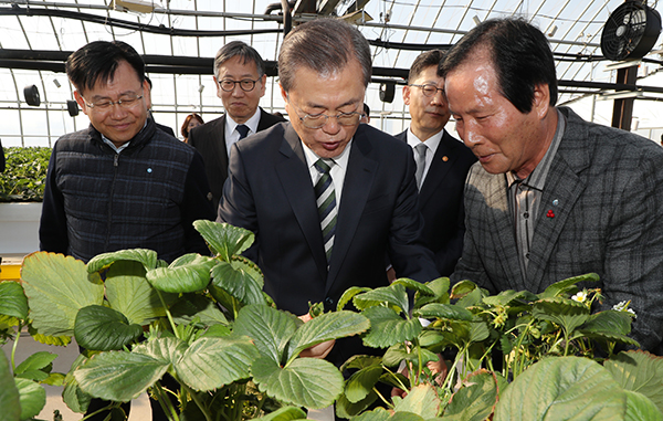 문재인 대통령이 12일 오전 전북 완주시 국립원예특작과학원 쿨링하우스를 방문, 쿨링하우스에서 재배된 딸기를 둘러보고 있다. (사진=(c) 연합뉴스) |