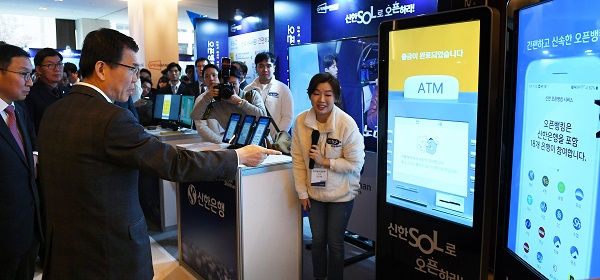 은성수 금융위원장을 비롯한 금융 관계자들이 18일 오전 서울 중구 웨스틴조선호텔에서 열린 ‘오픈뱅킹 서비스 출범식’에 참석해 신한은행의 오픈뱅킹 활용 서비스 시연을 보고 있다. (사진=(c) 연합뉴스) |