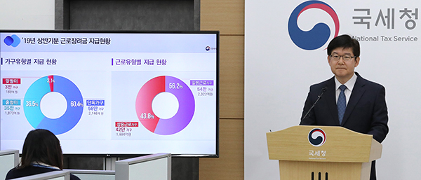 김진현 국세청 소득지원국장이 18일 세종시 정부세종 2청사에서 근로장려금 확대 개편, 2019년 상반기 귀속분 96만 가구 4200억원 지급 관련 브리핑을 하고 있다.(사진=(c) 연합뉴스) |