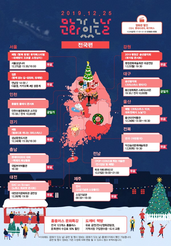 [일간환경연합 한선미 기자]12월 문화가 있는 날은 가족, 친구, 직장 동료 등과 함께 문화 행사를 즐기며 따뜻한 성탄절과 연말을 보낼 수 있다.