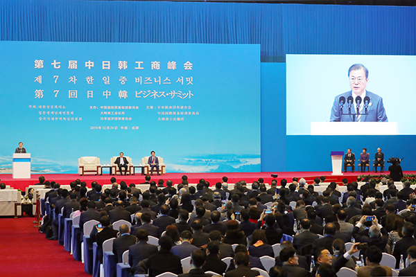 한일중 정상회의 참석차 중국을 방문 중인 문 대통령은 이날 오전(현지시간) 청두에서 열린 한일중 비즈니스 서밋에 참석, 기조연설을 통해 “우리는 무역장벽을 낮추고 스스로를 혁신하며 세계 시장을 무대로 성장해왔다. 자유무역은 기업이 서로를 신뢰하고 미래의 불확실성을 낮추는 안전장치”라며 이같이 밝혔다.