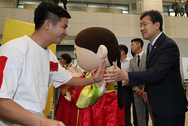지난 9월 2일 오전 인천국제공항에서 ‘베트남 환대주간’ 행사의 하나로 열린 공항 환영 행사에서 박양우 문화체육관광부 장관이 베트남 관광객들을 반갑게 맞이하고 있다. (사진=(c) 연합뉴스) |