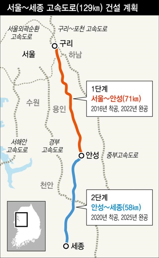 서울~세종 고속도로는 정부의 국정운영 5개년 계획에 포함되어 조기 구축을 추진 중인 사업으로 총사업비 9.6조 원, 연장 128.1km, 왕복 4~6차로 신설노선이며, 앞서 착공한 안성~구리 구간은 2022년 12월, 이번에 착공하는 세종~안성 구간은 2024년 6월에 개통하는 것이 목표이다.