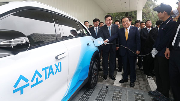 문희상 국회의장과 이낙연 총리가 지난 9월 10일 오후 여의도 국회 의원회관 앞에서 열린 국회 수소 충전소 준공식에서 수소 충전 시연을 하고 있다. (사진=(c) 연합뉴스) |