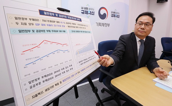 기획재정부 한재용 재정건정성과장이 26일 오전 세종시 정부세종청사에서 2018 회계연도 일반정부 및 공공부문 부채 실적 발표를 하고 있다. ((c) 연합뉴스) |