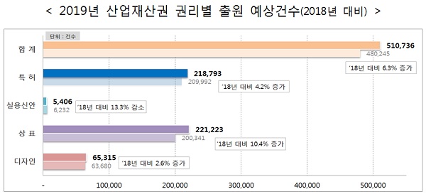 권리별로 살펴보면, 상표 출원이 작년 보다 10.4% 증가하고, 특허와 디자인도 각각 4.2%, 2.6% 증가할 것으로 보인다.