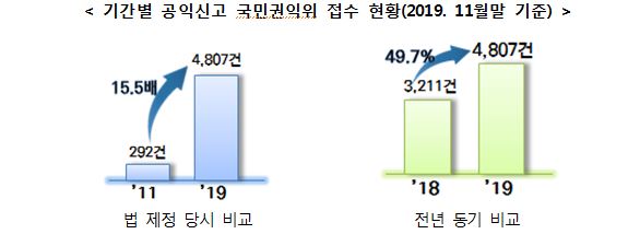 2011년 법 제정 이후 올해까지 국민권익위에 접수된 공익신고는 총 3만 3,095건으로 집계됐다. 2011년 292건에서 올해 4,807건으로 15배 이상 증가하고 지난해 대비 49.7% 증가한 것으로 나타났다.