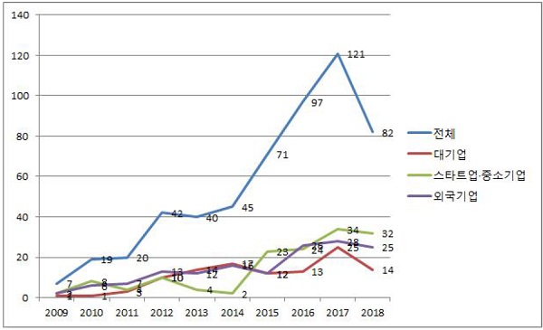 스타트업·중소기업은 2014년까지 10건 미만으로 출원해 오다가 2015년에 20건 이상 출원한 후 최근에는 30건 이상 출원하고 있는 것으로 조사됐다. 이와 같은 경향은 새로운 형상설계와 이에 따른 원가절감기술 개발에 창의적인 아이디어를 가진 스타트업과 중소기업이 적합하기 때문인 것으로 풀이된다.