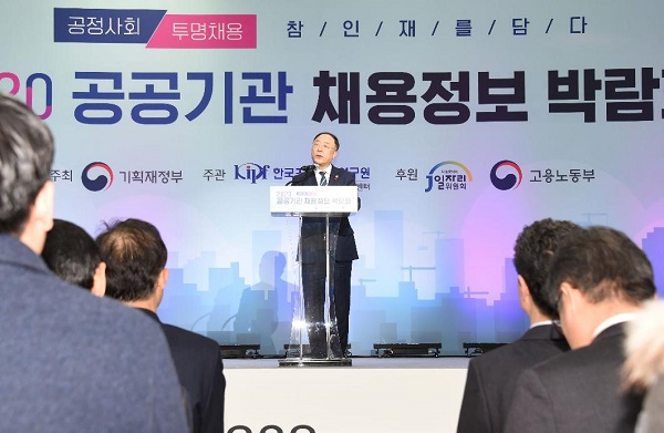 홍남기 부총리 겸 기획재정부 장관이 8일 서울 양재동 aT센터에서 열린 ‘2020년 공공기관 채용정보 박람회’에 참석해 개회사를 하고 있다. (사진=기획재정부 제공)그러면서 “올해는 혁신성장을 이끌어갈 연구인력, 에너지 및 보건의료 서비스 강화를 위한 인력 등 공공서비스 확충을 통한 국민의 삶의 질 향상에 기여할 인재를 중심으로 채용할 계획”이라며 “공정의 가치를 더욱 확고히 하고 사회적 가치 확산에도 역점을 두겠다”고 덧붙였다.