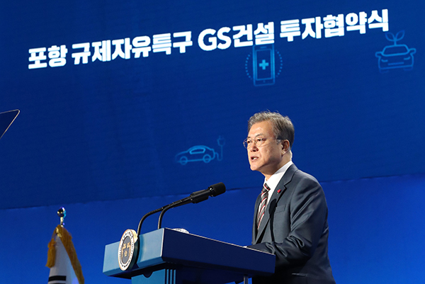 문 대통령은 이날 오전 경북 포항 포항종합운동장 실내체육관에서 열린 ‘포항규제자유특구 GS건설 투자협약식’에 참석, 축사를 통해 이같이 밝혔다.