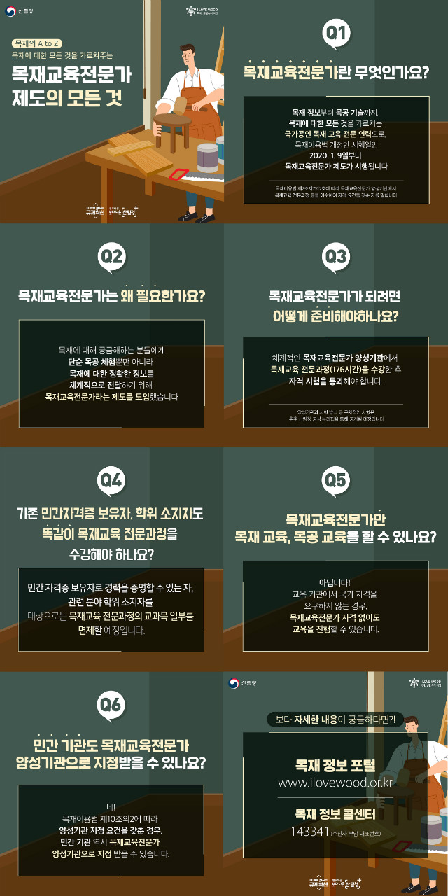 이종수 목재산업과장은 “목재교육전문가 제도 시행으로 목재가 국민들의 일상 속에서 더욱 친근한 소재로 다가갈 수 있을 것”이라고 말했다.