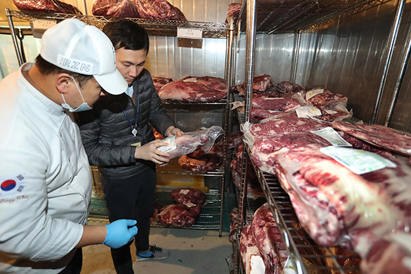 한 축산유통매장에서 관계자 등이 특별점검을 하고 있다.(사진=(c) 연합뉴스)점검결과 위반이 확인된 업체는 관련 법령에 따라 500만원 이하의 벌금이나 과태료가 부과된다.