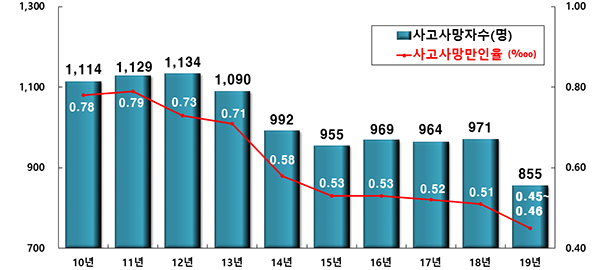 이에 따라 사고 사망자가 처음으로 800명대로 하락했으며, 사고사망 만인율도 0.510/000에서 0.45∼0.460/000으로 하락하면서 최초로 0.4대에 진입했다.