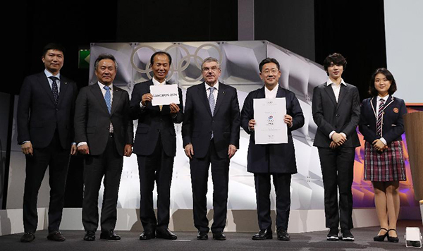 유승민 국제올림픽위원회 위원과 이기흥 대한체육회장, 최문순 강원도지사, 차준환 피겨스케이팅 선수, 최연우 강릉 해람중학교 학생, 박양우 문체부 장관은 순서대로 단상에 올라 청소년을 위한 대회 이상(비전)과 함께 한국이 2018 평창 동계올림픽을 개최한 경험과 유산을 활용해 차기 대회를 개최할 능력을 충분히 가지고 있음을 피력했다. 또한 앞으로 대내외의 여건이 허락될 경우 남북 공동개최 가능성을 열어두고 있다는 점을 강조했다.