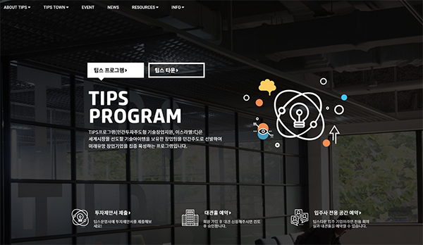 팁스 홈페이지 메인화면.팁스(TIPS, Tech Incubator Program for Startup)는 창업팀을 선별, 민간투자자나 정부 연구개발(R&D) 사업과 연계해 창업을 촉진해주는 기술창업 지원 프로그램이다. 올해 해당 프로그램에 1951억원의 예산이 책정됐다.