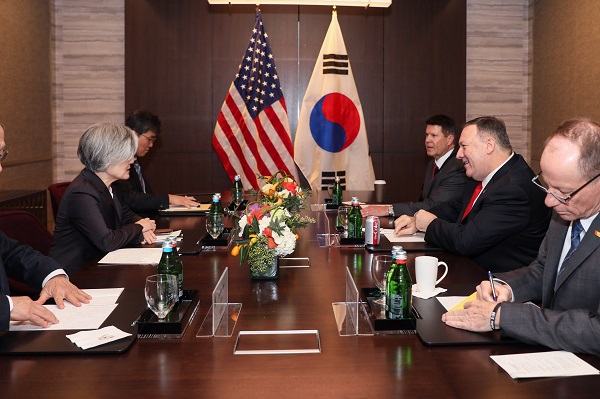 [일간환경연합 한선미 기자]강경화 외교장관은 14일(현지시각) 미국 샌프란시스코 인근 팰로앨토의 포시즌 호텔에서 마이크 폼페이오 미국 국무장관과 회담을 갖고 한반도 정세 및 동맹 현안, 역내 및 최근 중동 정세 등 상호 관심사에 대해 협의했다.
