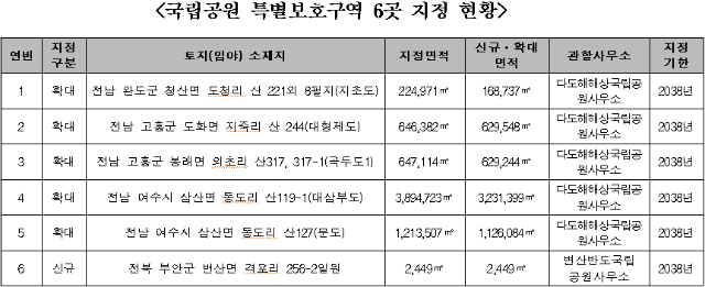 [일간환경연합 김경훈 기자]환경부 산하 국립공원공단(이사장 권경업)은 변산반도 1곳을 새로 지정하고 기존 다도해해상 5곳의 면적을 확대하는 등 총 6곳을 '국립공원 특별보호구역'으로 1월 16일부터 신규·확대 지정하여 2038년까지 관리한다.