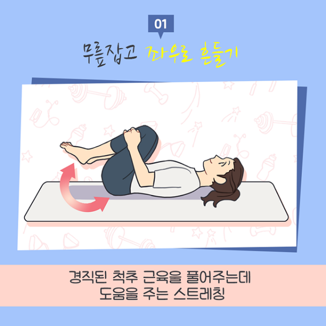 경직된 척추 근육을 풀어주는데 도움을 주는 스트레칭 동작이다.