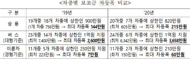 기재부와 환경부는 전기차 성능 향상을 유도하고, 보조금 집행의 효율성을 제고하기 위해 각계의 의견을 수렴하여 금번 제도개선 방안을 마련하였다. '19년과 달라지는 내용은 아래와 같다.
