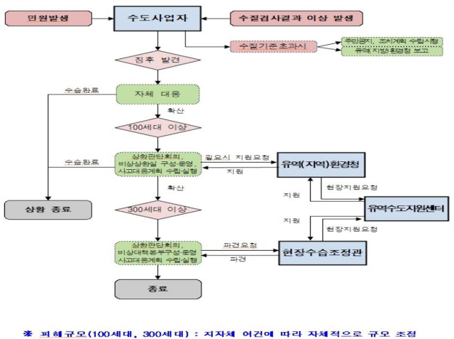 피해규모가 100세대 이상인 수돗물 사고가 발생하면 지자체의 수도사업본부장(소장)은 상황판단회의를 소집한 후 비상상황실을 운영하면서, 필요 시 유역(지방)환경청의 지원을 요청할 수 있다. 센터는 유역(지방)환경청의 지휘 아래 기술적·인적 지원을 실시한다.