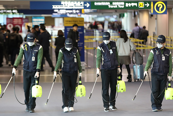 21일 오전 인천국제공항 1터미널 입국장에서 인천공항 위생소독용역 직원들이 ‘우한(武漢) 신종 코로나바이러스 폐렴’ 국내 추가 유입에 대비해 소독 작업을 하고 있다. (사진=(c) 연합뉴스)질병관리본부는 이날 현재까지 확진환자의 동행자 5명의 특이소견은 없었다면서 이중 3명(접촉자 중 출국자 9명에 포함)은 20일 일본으로 출국했고, 2명은 21일 오후 중국으로 출국한다고 밝혔다.