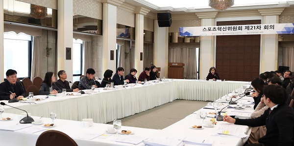 스포츠혁신위원회 위원들이 22일 서울 중구 프레스센터에서 제21차 전체회의를 진행하고 있다.체육요원 제도 개선 및 스포츠윤리센터 법적 근거 마련