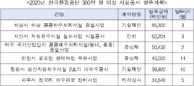 300억 원 이상 시설공사 6건 가운데 최대 규모의 공사는 853억 원 규모의 '하남시 하남 공공하수처리시설 증설사업'으로 올해 3월 발주할 예정이다.