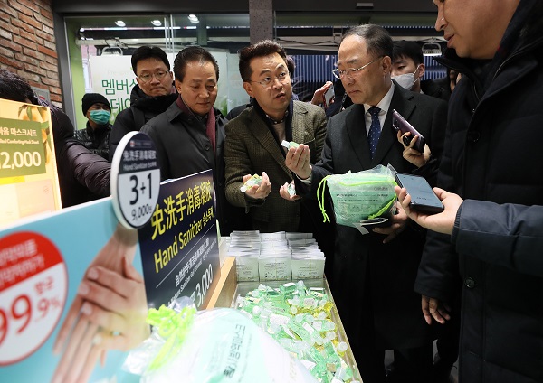 홍남기 경제부총리 겸 기획재정부 장관이 신종 코로나바이러스 관련 현장을 점검하기 위해 3일 오후 서울 중구의 한 화장품점을 들러 마스크와 손소독제를 살펴보며 관계자의 설명을 듣고 있다. (사진=(c) 연합뉴스)이를 위해 정부는 관광·제조·해운·항만·항공 등 관련업종에 미치는 영향을 분석중이며, 현장의견을 수렴해 신속히 내수활성화 대책을 마련할 예정이다.